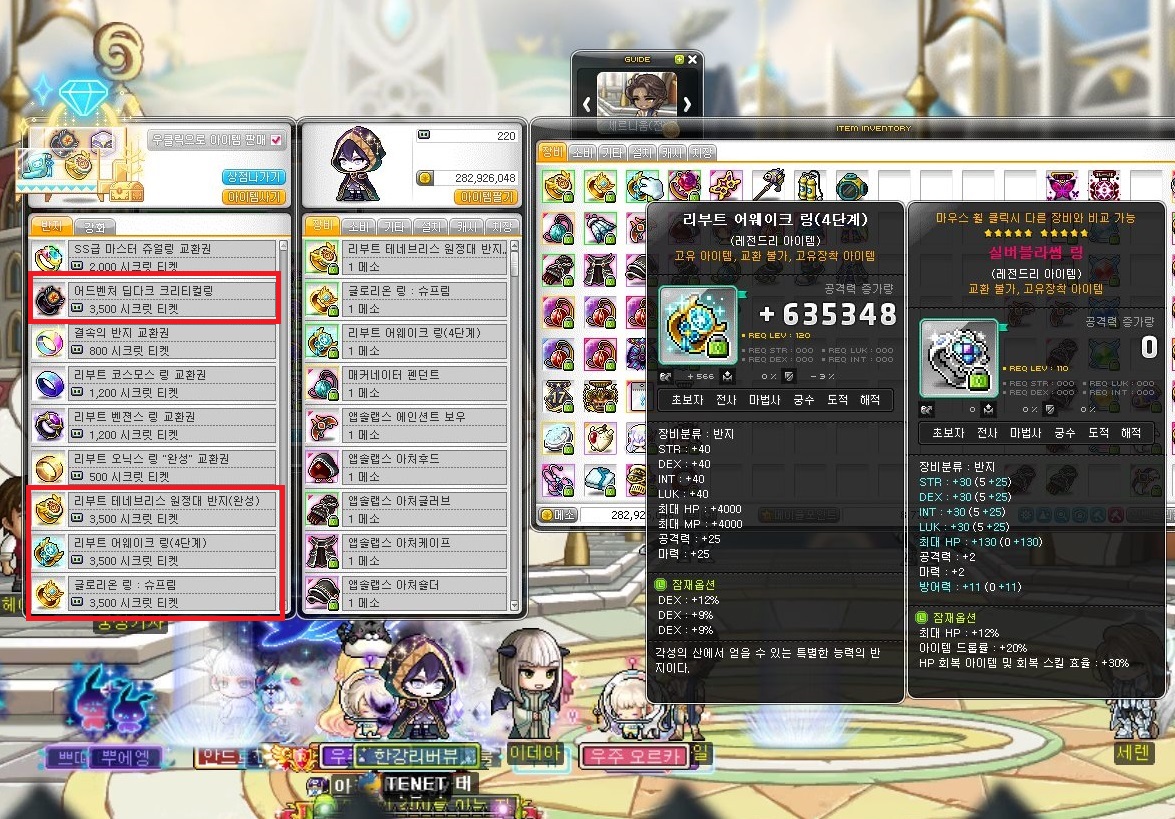 | · 거대한공포 22성 ·(여명의)가디언 엔젤 링 22성 ·마이스터 링 22성 ·시드링 레벨4(리스트레인트링, 리스크테이커링, 웨폰퍼프링) |