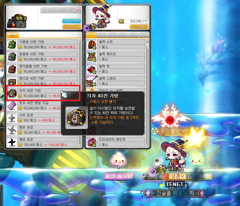 다른 아이템들과 비슷하게 이벤트 보상으로 받다 보면 어느 순간 쌓이게 되는데 마을 잡화상점에서 의자 40칸 가방을 5000만 메소에 구매하여 공간을 줄일 수 있다. 최대 5개까지 소지가 가능하므로 가방으로만 200개 의자를 보관할 수 있다.