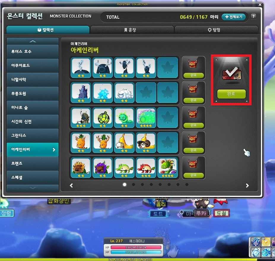 아케인리버 내 아케인리버 몬스터 리스트 완성 보상(아케인리버 8번째 우측 탭 목록에 위치) | |