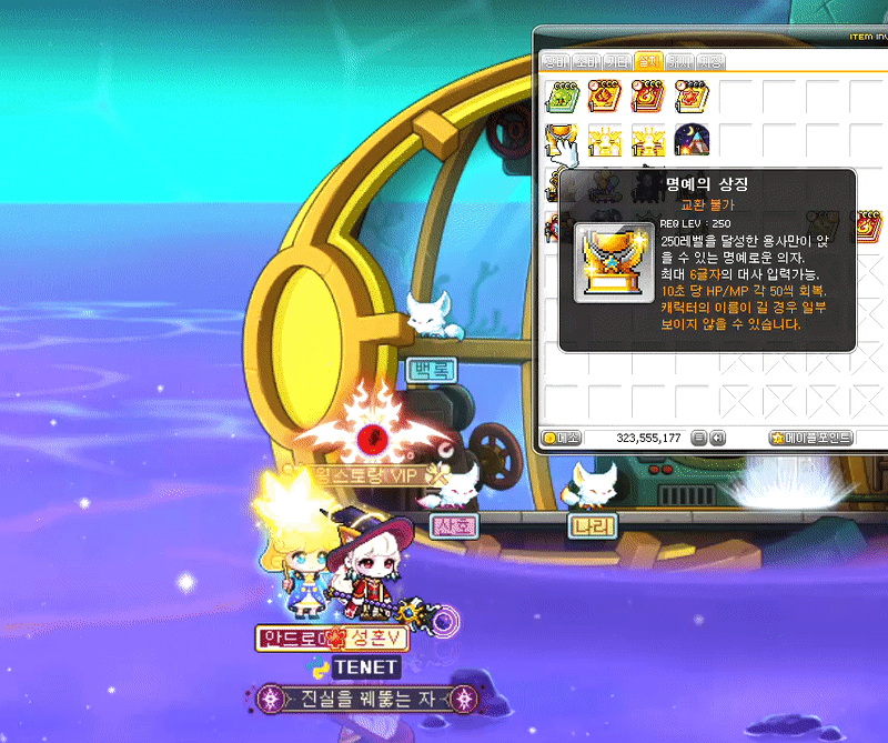 · 레벨 250 달성 후 (Lv.250) [250레벨 달성] 명예로 빛난 희망의 빛 퀘스트 · 의자 사용시 최대 6글자 메시지 출력 가능 · 해당 의자 사용하고 있는 유저에게 인기도 상승시 30분간 공마 +40 버프 증정 |