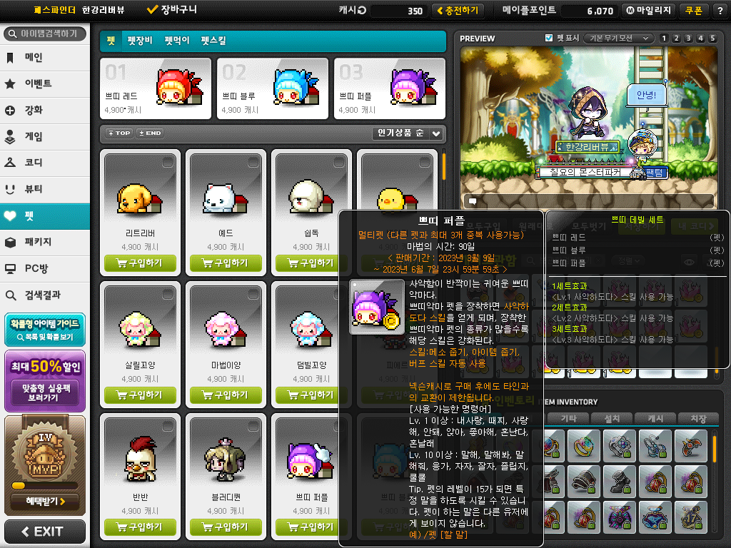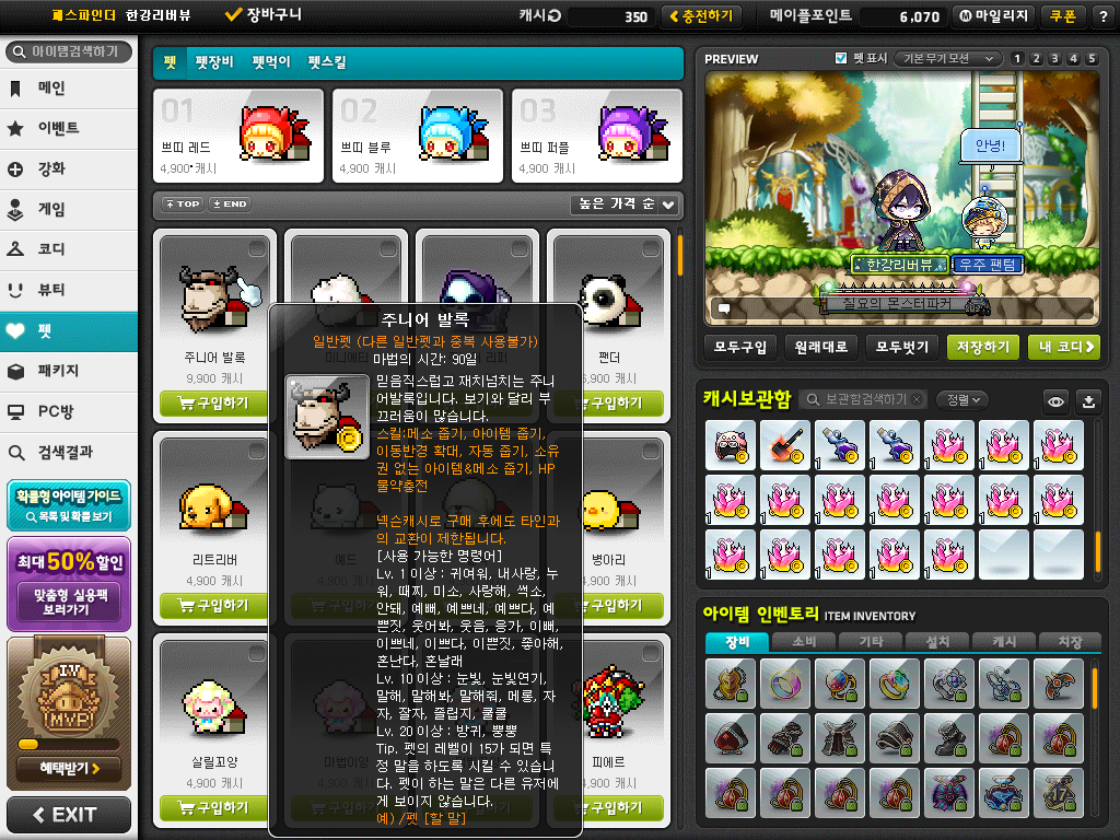 | NEW 펫 스킬 패키지 | 4,900 캐시 | 펫 훈련 스킬 + HP 물약충전 스킬 + MP 물약충전 스킬 + 이동반경 확대 스킬이 포함된 패키지. | |