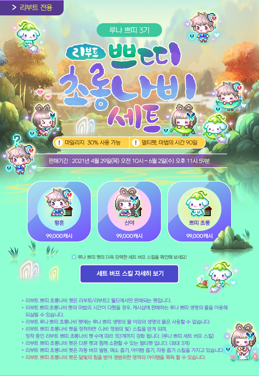 | 루나 쁘띠 생명의 물(30일) | 13,900 캐시 | 루나 쁘띠 펫 전용 부활 아이템(샤벳, 솜사탕 핑크빈의 경우 사용 불가) | |